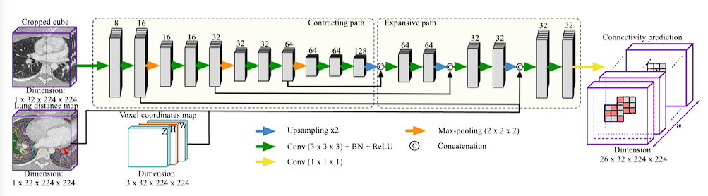 沿用了3D U-net的框架,在扩展路径的1*1连接之前串联了坐标和距离信息,最后每个体素得到的26列向量各自走Sigmoid函数,得到概率