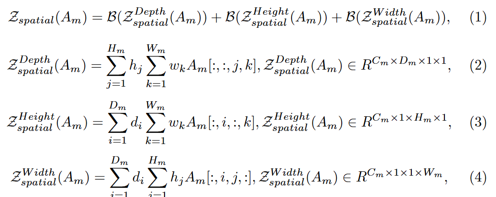 其中\(\mathcal{B}(\cdot)\)表示广播;\(h_i, d_i, w_i\)都是可以学习的权重,在训练时不同的卷积层会对重要的区域产生偏好