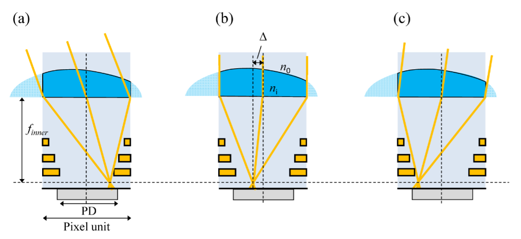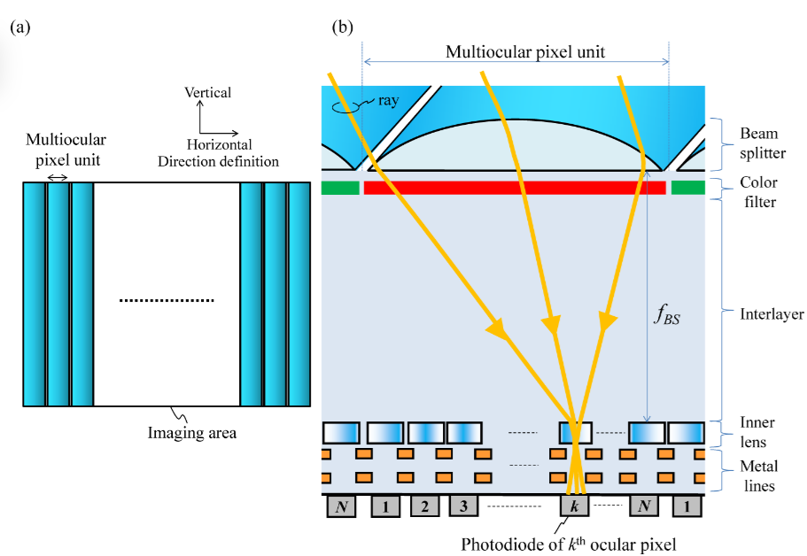 外部透镜的焦距要使得聚焦的光线能够到达第1,N个内部透镜,经过内部透镜将光线聚焦到每一个光电二极管(也就是第k目),金属线的作用是限制入射光的角度,相当于场光阑