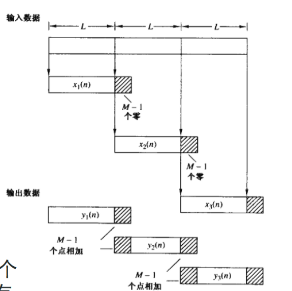 - 将\(h(n)\)补到\(L+M-1\),将输入\(x(n)\)划分为长度为\(L\)的小段,这个\(L\)相比于整个序列很小