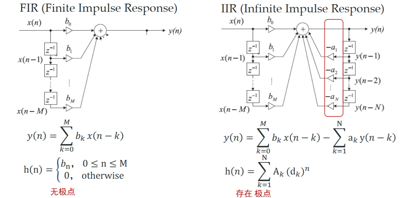 根据是否有限,分为FIR和IIR两种,二者的框图如下