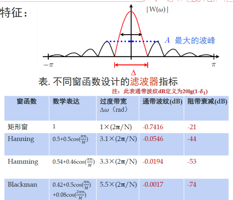 同上述关系,窗函数\(W(\omega)\)的主瓣宽度正相关于滤波器的过渡带宽\(\Delta \omega\),\(\delta_1,\delta_2\)产生自sinc的旁瓣