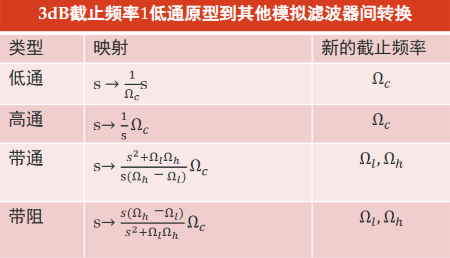 对这张表的修正:低/高通的\(\Omega_c\)变为\(\Omega_p\),带通/阻的\(\Omega_c\)变为1,\(\Omega_l/\Omega_h\)指的是通带截止频率