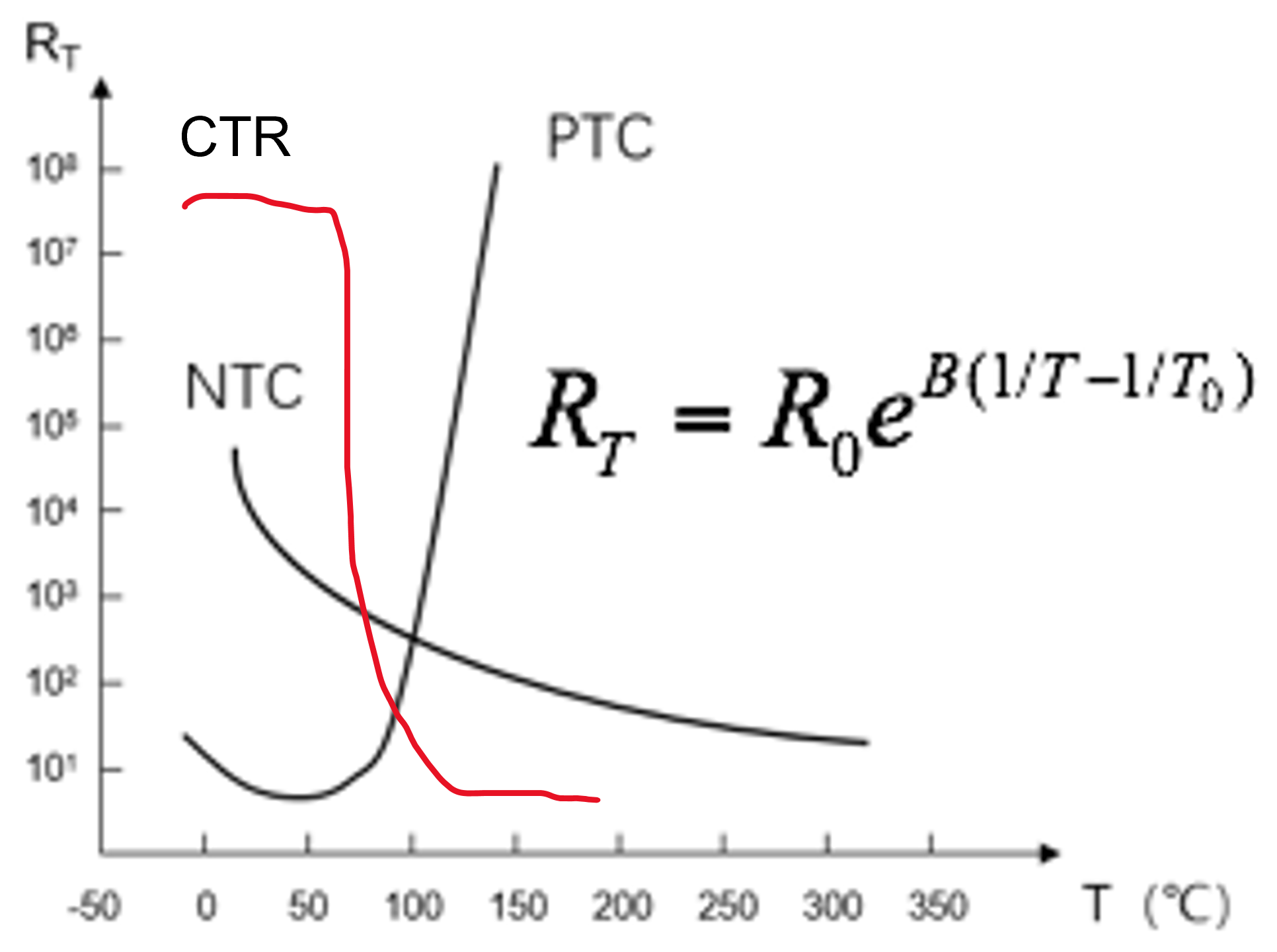 - 临界温度系数(CTR)热敏电阻,当温度升高到某临界点时,电阻值突然下降