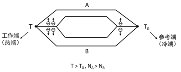 两种不同的金属导体组成闭合回路,两端产生温度差,电子的运动产生差异,热运动快的电子扩散向另一端,产生了一个空间电场区