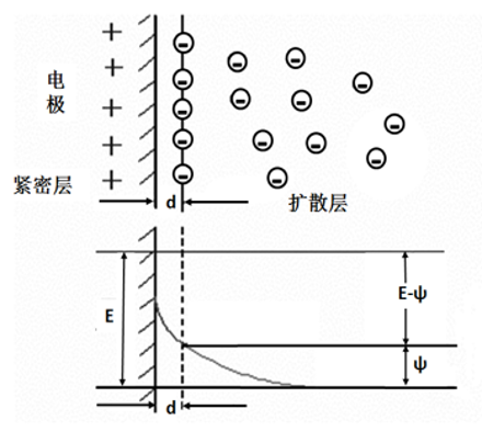 电极和介质存在电势差,在界面上吸引正/负电荷,形成紧密层,在紧密层中发生电化学反应