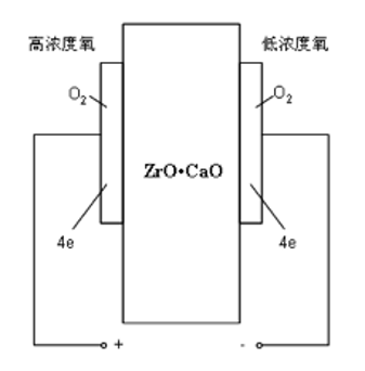 正极(低浓度)发生:\(2O^{2-} \rightarrow O_2+4e^-\);负极(高浓度)发生:\(O_2 + 4e^-\rightarrow 2O^{2-}\)