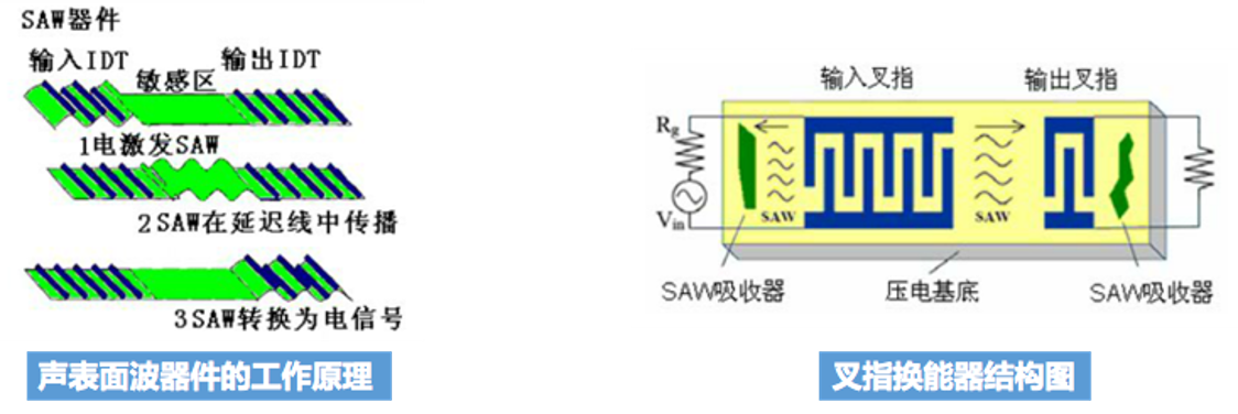 利用压电和逆压电效应,由于敏感区的质量/折射率等变化,接收到的电压会变化,核心是叉指换能器,实现声电换能