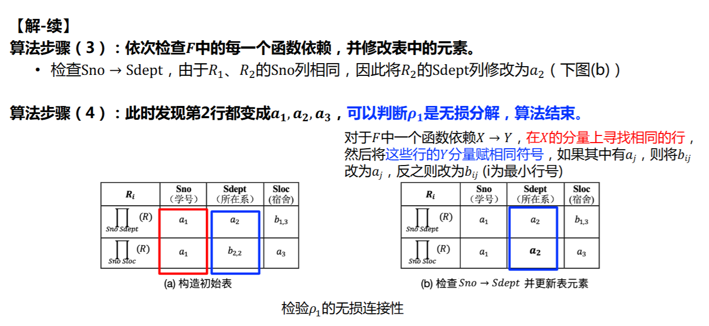 - 如果存在一行为\(a_1,a_2,\ldots ,a_n\),那么\(\rho\)是无损分解,否则不是