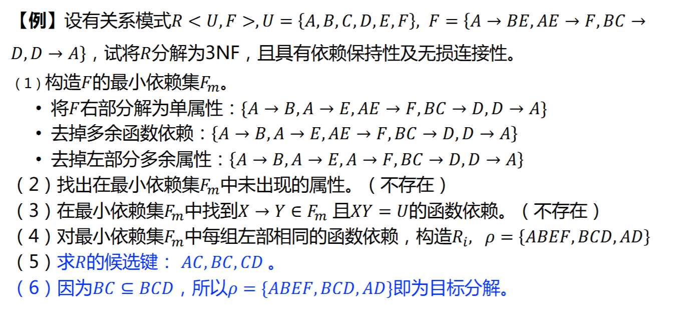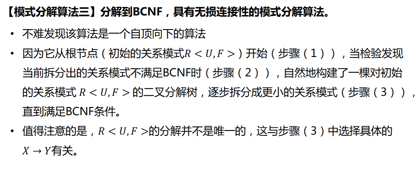 - 依赖不丢失:\(F_i\)是\(F\)在\(U_i\)上的投影,\(F_i=\{X\rightarrow Y|X\rightarrow Y \in F^+\and XY\subseteq U_i\}\)