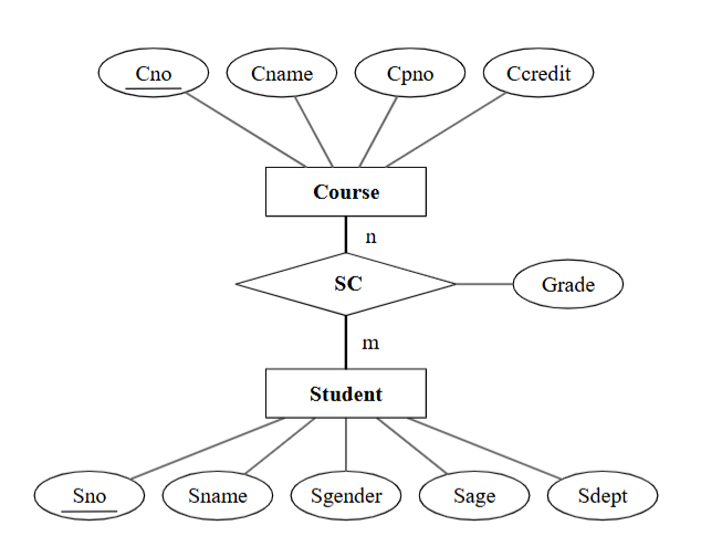数字:从对面看,二者的关系数量,图中就是说一个学生对应n门课,一门课对应m个学生,这里的\(m,n\)都是虚指,意思是学生和课程是多对多关系