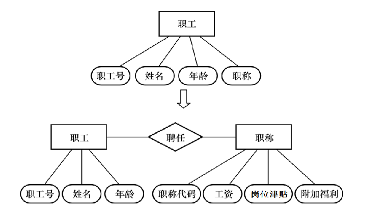 如下面的例子,如果”职称“与”工资“无关,那么可以向上图定义;但是如果有关,那么就得用下面的模式