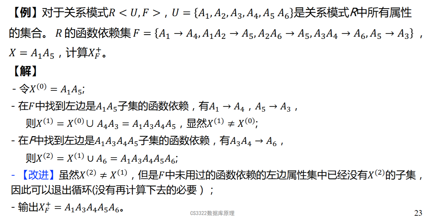 - 判断函数依赖是否成立:\(X\rightarrow Y \in F^+\Leftrightarrow Y\subseteq X^+_F\)