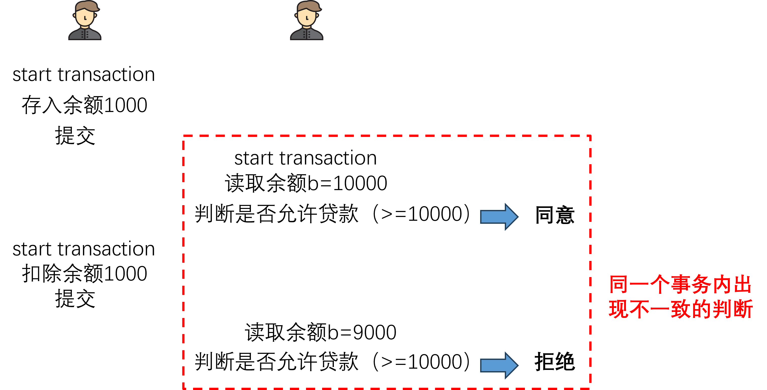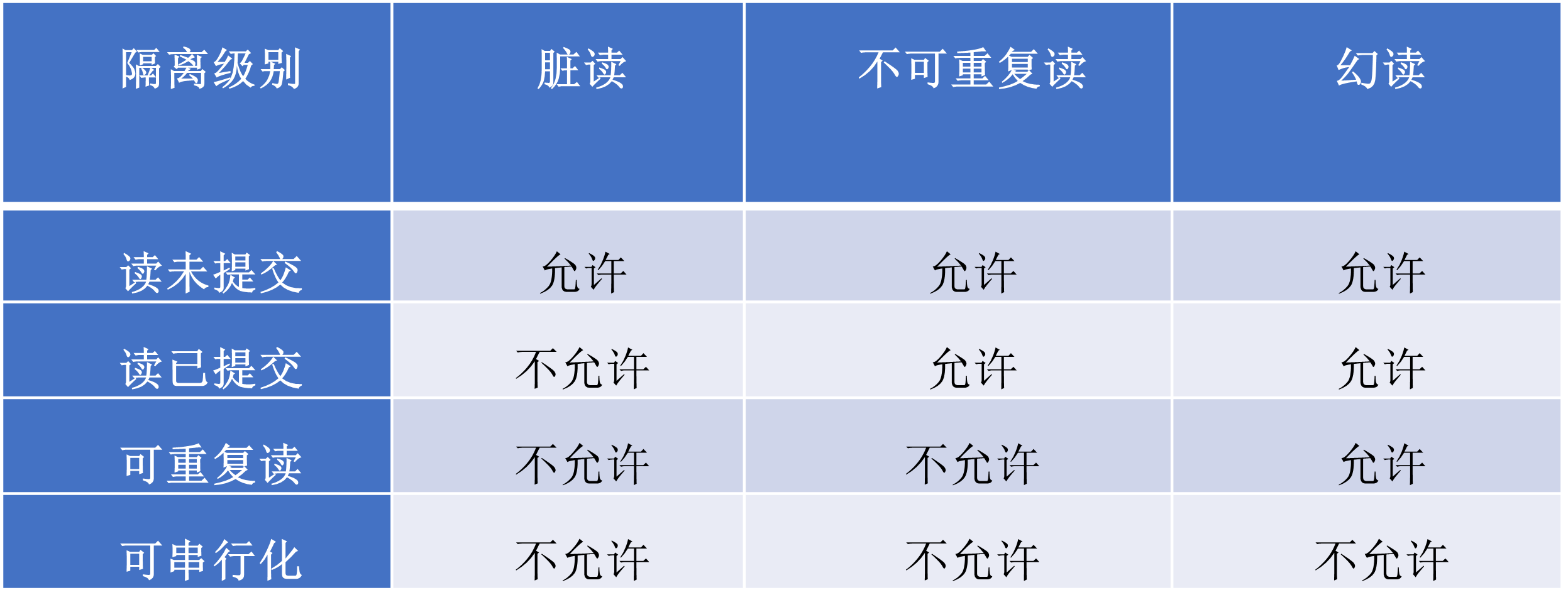 - 可重复读:确保事务可以多次读取统一数据,保证每次结果相同