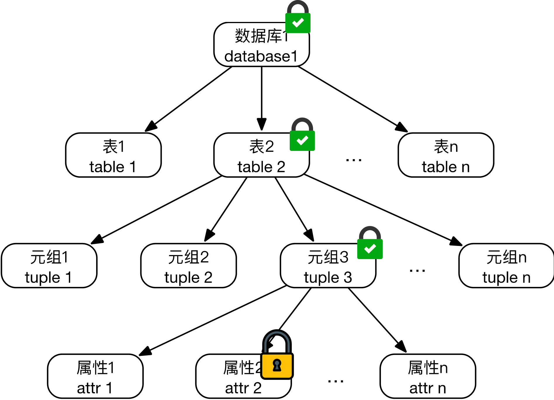 数据库中所有对象构成一棵多粒度树,每一个节点都可以独立加锁