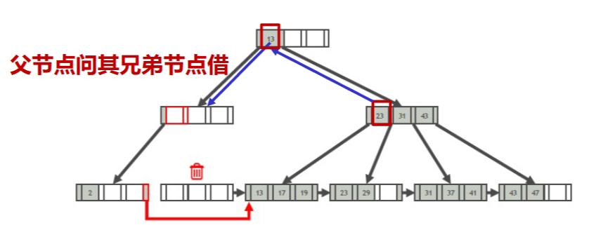 - 向兄弟节点借一个叶子,并且更新被借的兄弟节点,使二者都半满