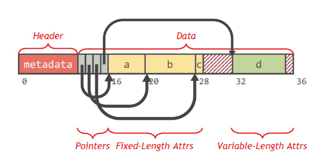 按照关系定义的顺序存储各个属性,定长的属性写在前边,变长的(VAR)用指针指向末尾,从后向前写;记录头后紧跟着指针数组,指向每个属性