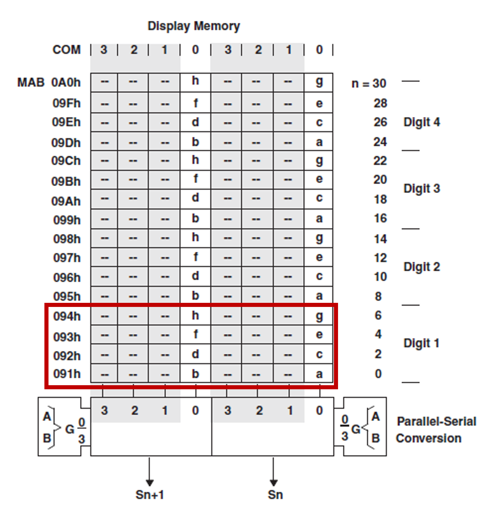 当前选通COM0,不用管其他的bit,只看COM0的位置,图中红框表示控制一个数码管的内存