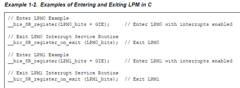 进入:设置LPM0 - LPM4的SR寄存器中的CPUOFF, OSCOFF, SCG0, SCG1来实现