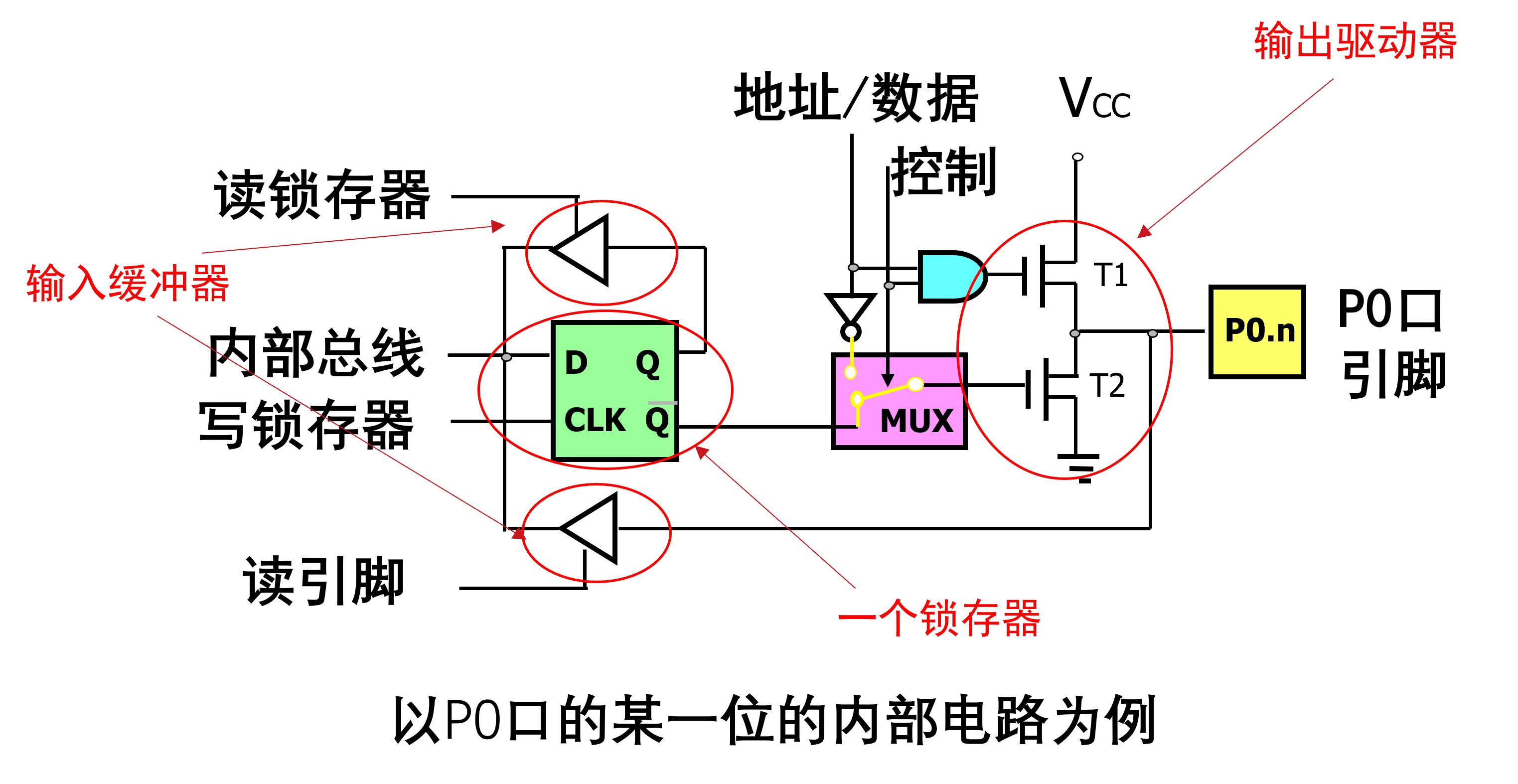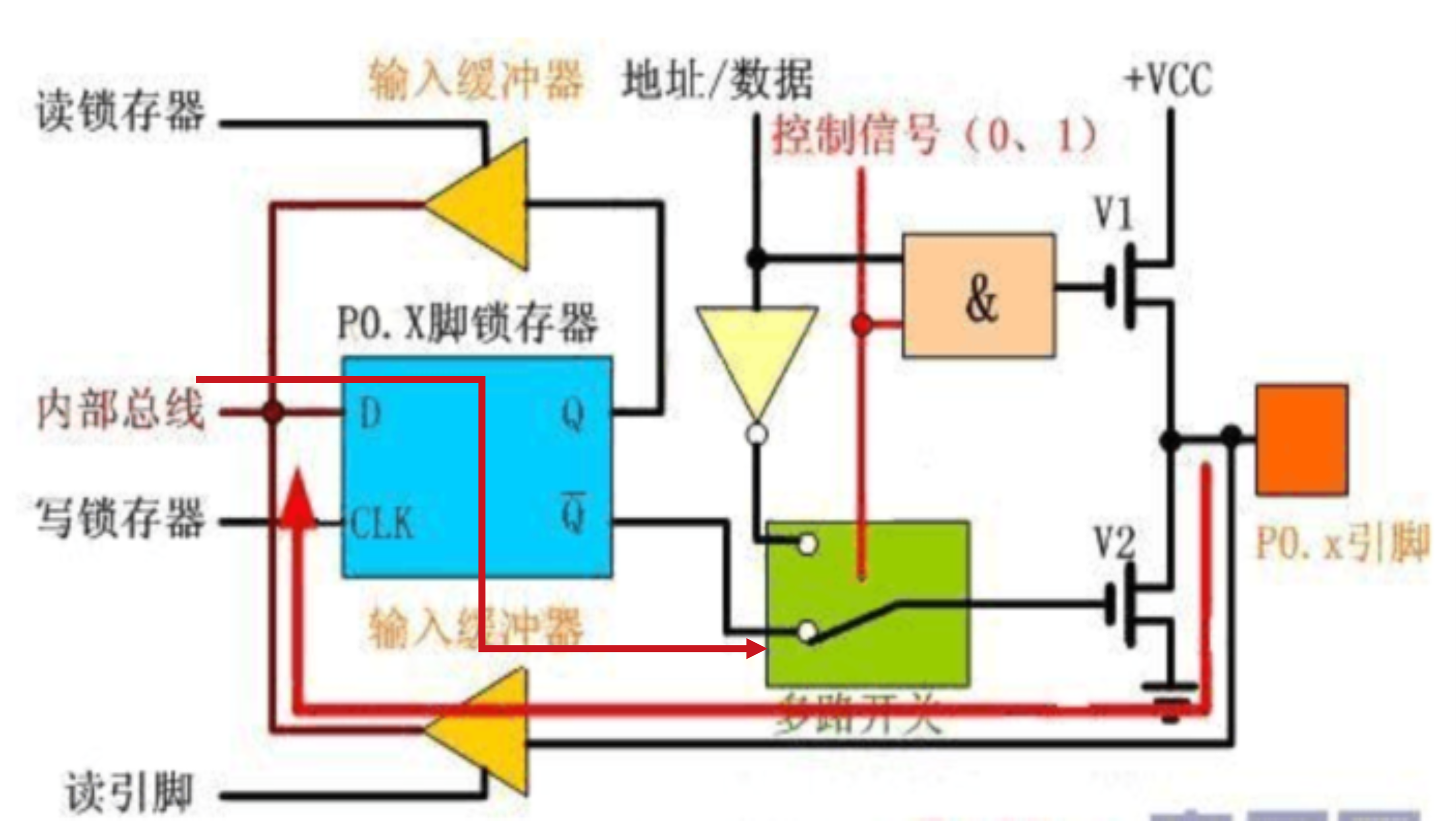 锁存器就是专用寄存器P0/1/2/3,这个是P0口,故MUX控制输出的是低地址还是数据