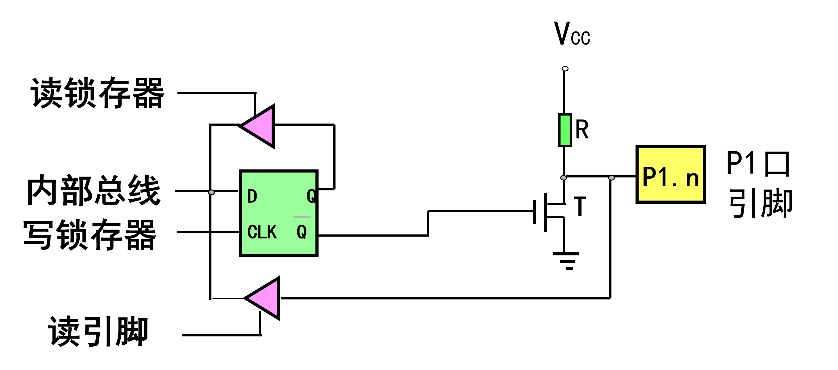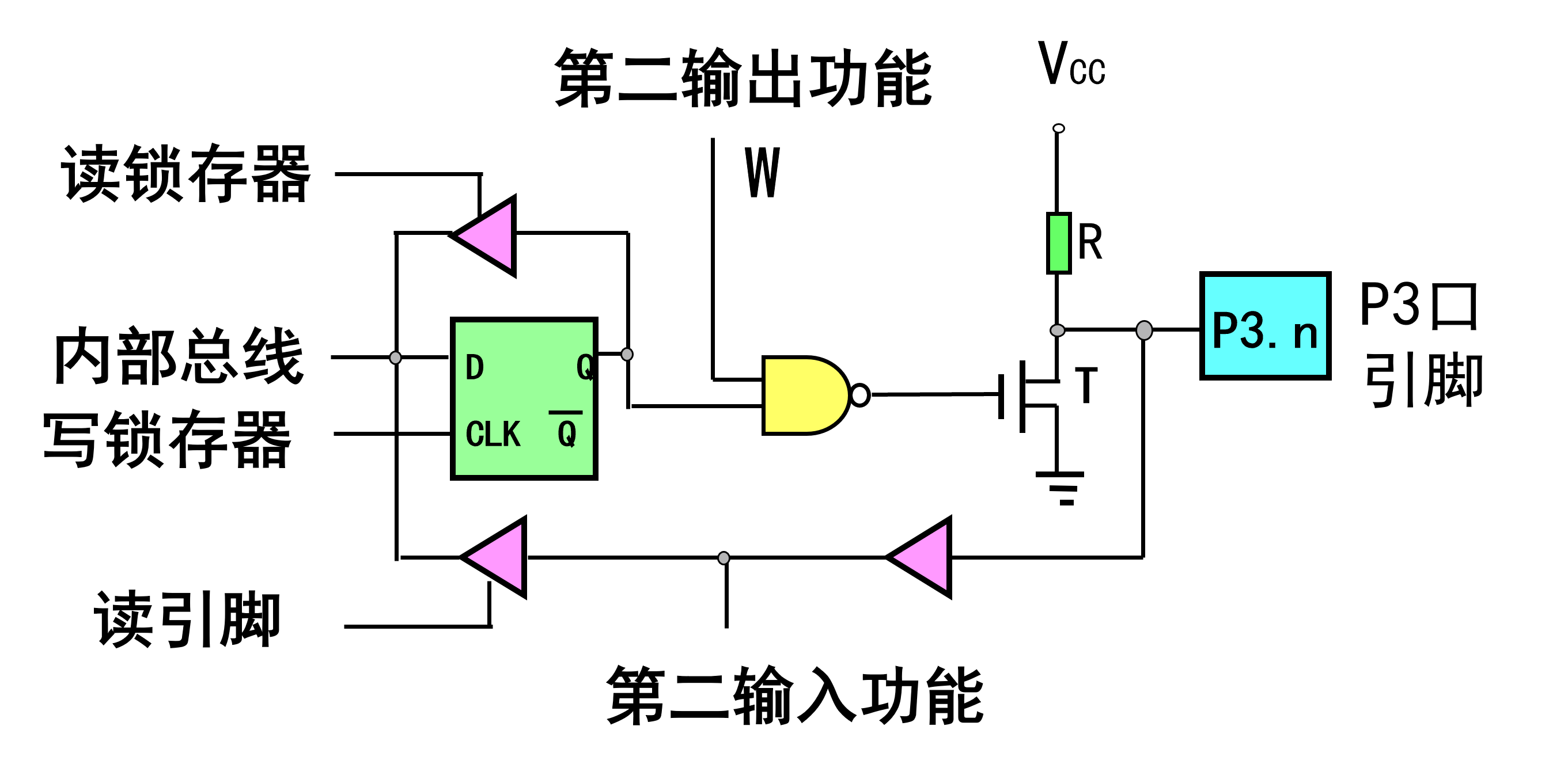 读引脚,通常是I/O为源的指令,如MOV A, P2,走下方的输入Buffer到内部总线