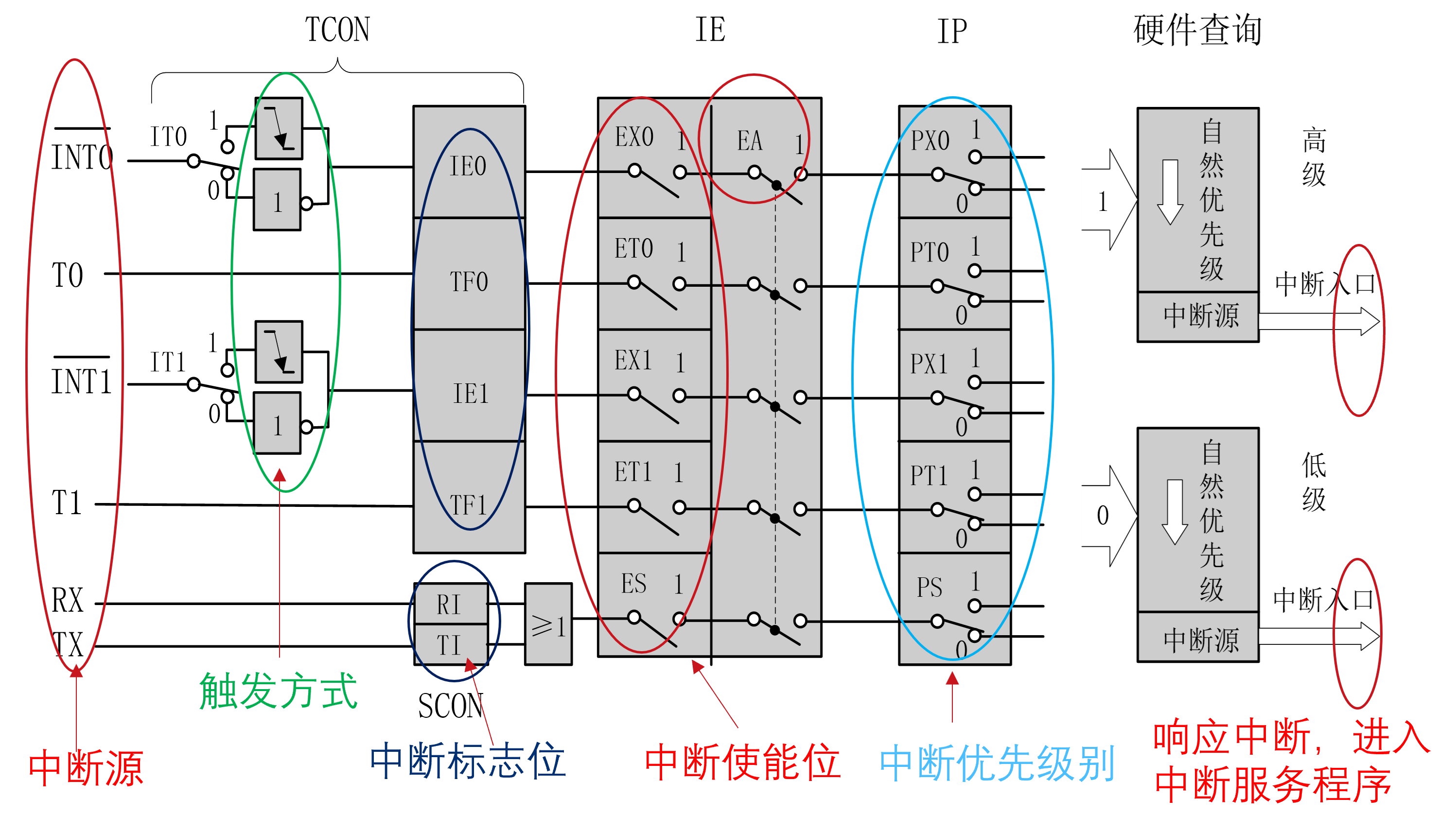 - 在机器周期的S5P2期间,中断系统对各个源采样,这些采样值在下一个机器周期内按优先级查询