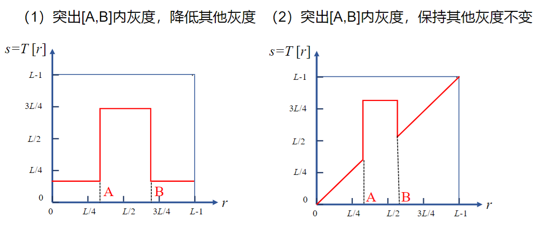 空间域内将一个灰度区间映射到另一个灰度区间:\(g(x,y)=T[f(x,y)]\),T为在(x,y)邻域上定义的算子
