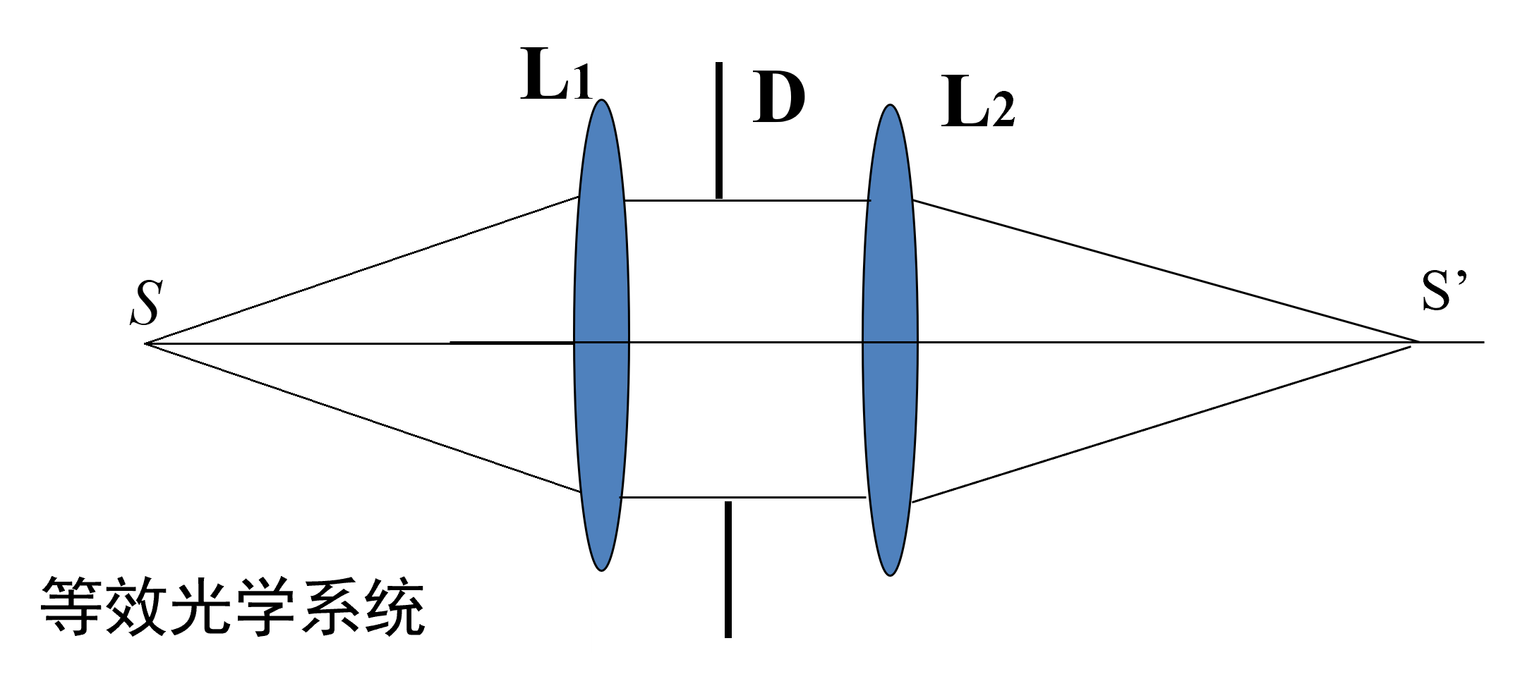 实际上的光学系统如下图,可以认为夫琅禾费衍射,事实上其光强分布和衍射完全一致,其分辨率受到限制