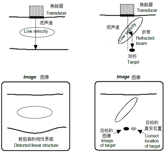 这会带来两个问题,第一个是折射伪影,见4.3.3节;第二个是线性界面扭曲,由介质间声速的变化导致