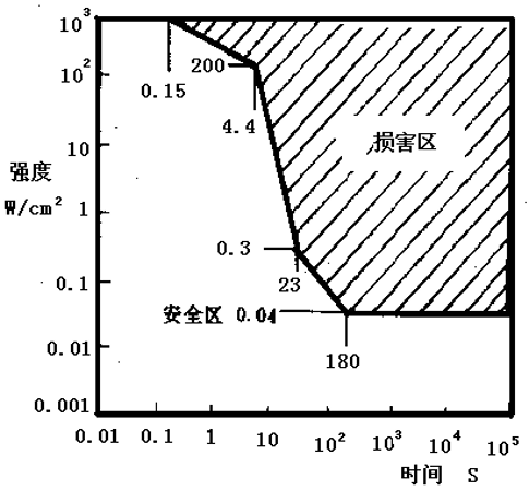 当超声持续时间不超过0.1s时,剂量多大都安全;剂量小于0.04W/cm^2时,时间多长都安全