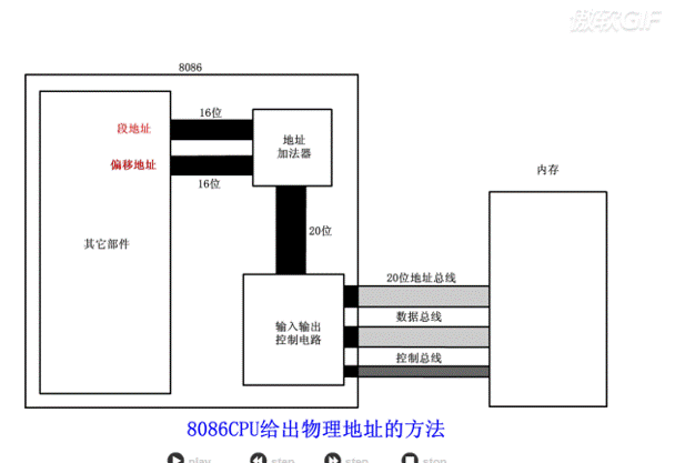 8086的寻址能力是\(2^{20}\),但是它是16位机,只能一次处理16bit,需要使用地址加法器合成物理地址