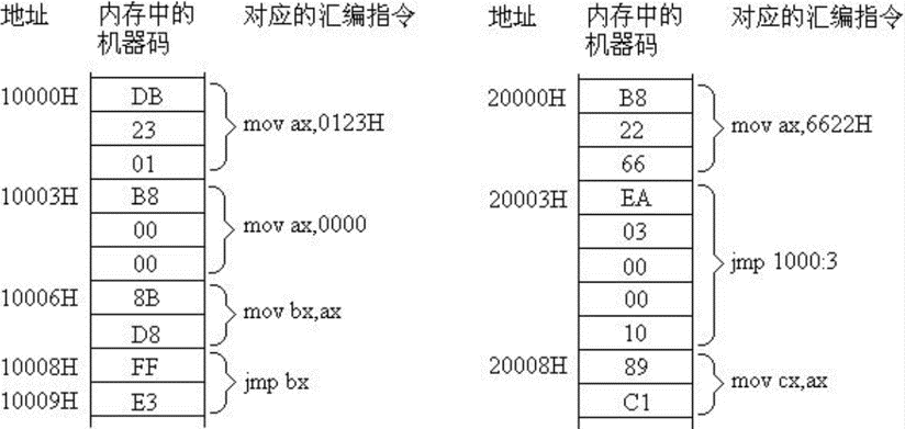- jmp 段地址:偏移地址:修改CS:IP,用于段间程序跳跃