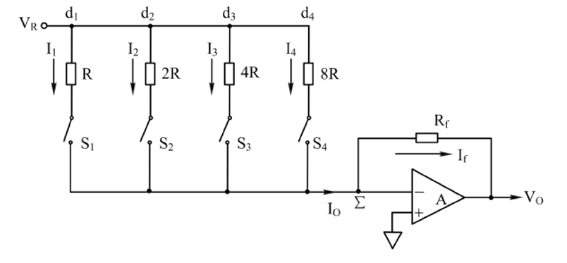 使用加权的电阻并联,每一个开关表示这个位置编码的0/1(当然实际上是半导体元件,不需要真的开关)